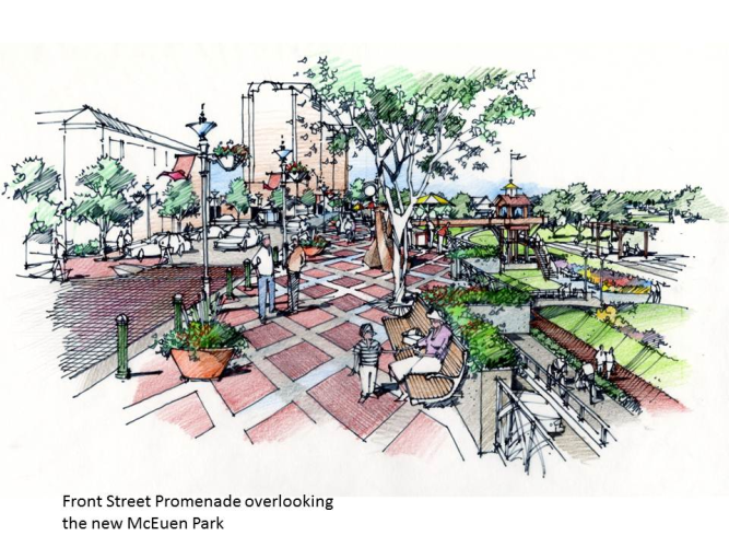Above, proposed Front Avenue promenade, overlooking McEuen Field. (Design: Team McEuen)