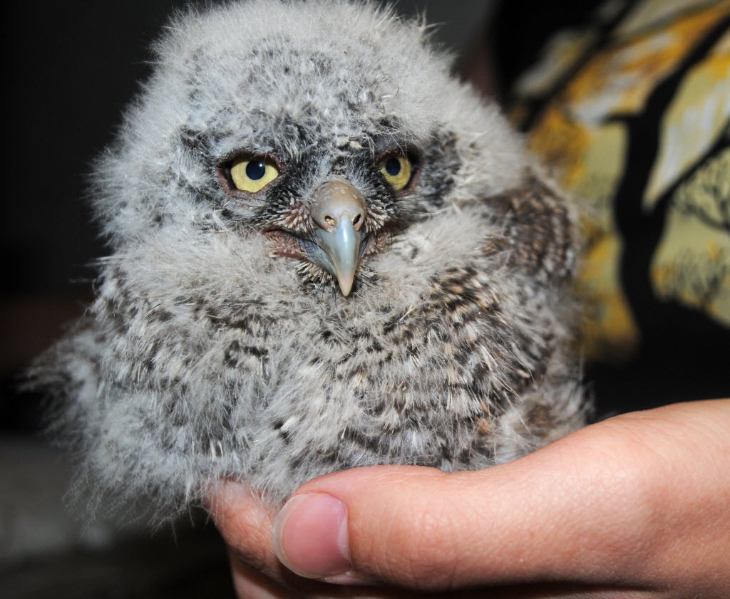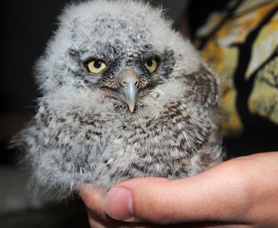 This baby great horned owl is one of nine being raised by veterinarians at Washington State University after the birds’ nests were destroyed. The owlets, five from one nest and four from another, are being hand-fed a diet of cut-up mice until they are strong enough to eat on their own. They must be fed three times a day. The first four were brought to the university April 13 at roughly 1 week old. Four days later, the second group arrived, at only a few days old. (AP Photo/Washington State University, Linda Weiford)