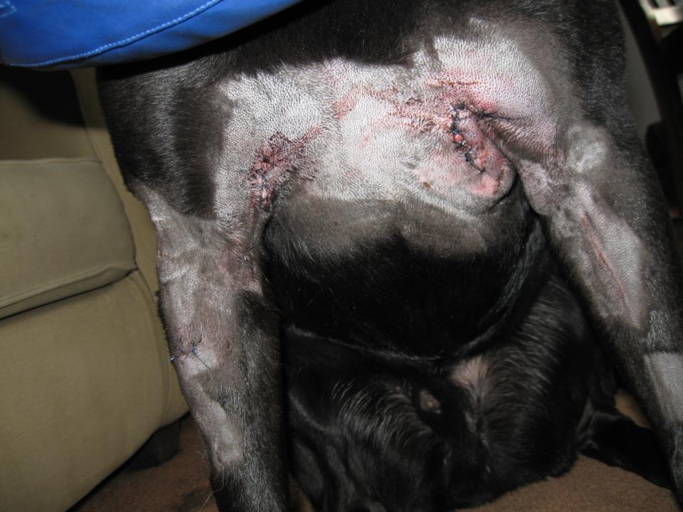 Harrison thought he got away unscathed until he got back and realized his other dog, Chewie, had tangled with the coyotes and suffered numerous bites and rips under his chest and legs.