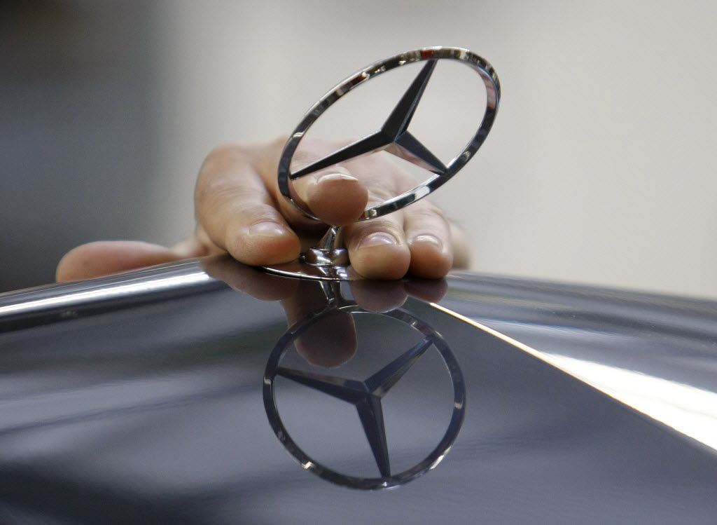 An employee of the Daimler AG mounts the Mercedes star on the hood of a car of the Mercedes-Benz E-class on the production line in the Mercedes-Benz site in Sindelfingen, Germany. Record sales of its luxury Mercedes brand and a stronger boost from financial services helped automaker Daimler increase net profit by 20 percent to euro 1.42 billion (US dollar 1.88 billion) in the first quarter, as they reported today. (AP Photo/Thomas Kienzle, File)