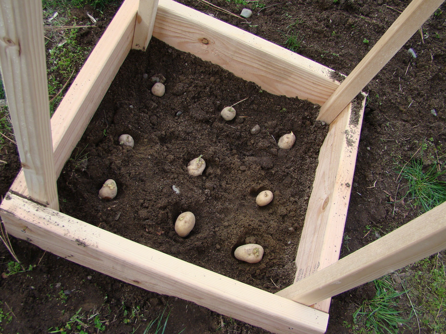 Starting with four corner posts (lengths of 2” x 2”) you add one row of 2” x 6” boards at the bottom of the posts, add seed potatoes (see photo above) and dirt to the level of the boards. When the plants form and grow to about 12”, add another layer of 2” x 6” boards and again add dirt to the level of the newly added boards, continuing until you have a box that is approximately 4 feet high. When the plants die back in the early fall you will (hopefully) have big, beautiful potatoes growing all through the box. To harvest, simply deconstruct the box from the top down, removing potatoes and dirt as you go.