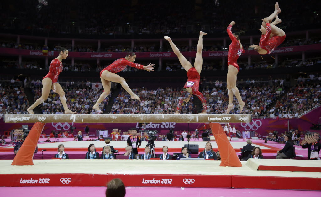 In this multiple exposure photo, U.S. gymnast Alexandra Raisman performs on the balance beam during the Artistic Gymnastics women’s team final at the 2012 Summer Olympics on Tuesday in London. The U.S. women’s gymnastics team won Olympic gold Tuesday here. (AP Photo/Julie Jacobson)