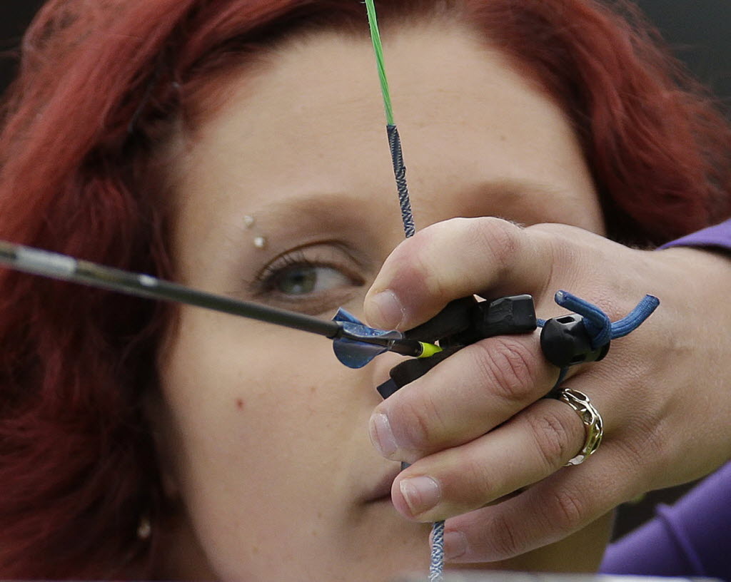 Canada’s Marie-Pier Beaudet aims for the target during an elimination round of the individual archery competition at the 2012 Summer Olympics today in London. (AP Photo/Marcio Jose Sanchez)