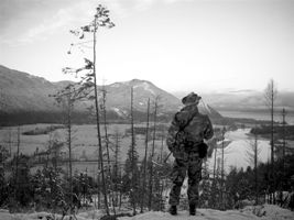 (Matt Mills McKnight photo: Cody Hoyt, a corporal in the Idaho regiment of the Light Foot militia, looks west over the Clark Fork River and Lake Pend Oreille near the Idaho and Montana border)
