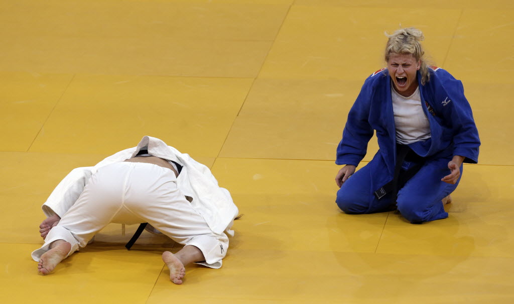 Kayla Harrison of the United States reacts while competing against Mayra Aguiar of Brazil, (in white), during the women’s 78-kg judo competition at the 2012 Summer Olympics today in London. (AP Photo/Ng Han Guan)