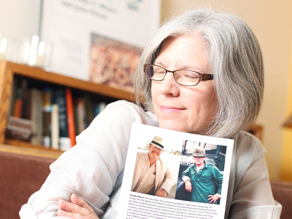 Julie Titone with a copy of Boocoo Dinky Dow, her late ex-husband’s war memoir. (Inlander photo: Young Kwak)