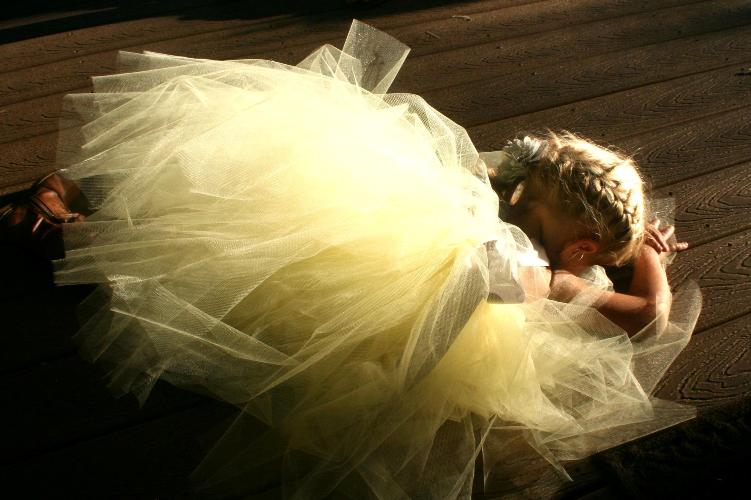 On her Facebook wall, Kerri Thoreson writes of this photo: ” We went to Twin Lakes for dinner and there was a wedding reception at the club house. Three darling little flower girls in buttermint yellow fluff were twirling around. The littlest girl tired of the twirling and took a brief rest before skipping off again.”