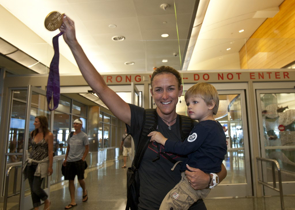 Kristin Armstrong, who won the gold medal in the women’s road time trial in cycling at the London Olympics, waves her medal to the crowd as she holds her son, Lucas William, 22 months, at the airport in Boise Saturday. Boise is planning an official welcome home for Armstrong next Saturday here. (AP/Statesman photo: Chris Butler)