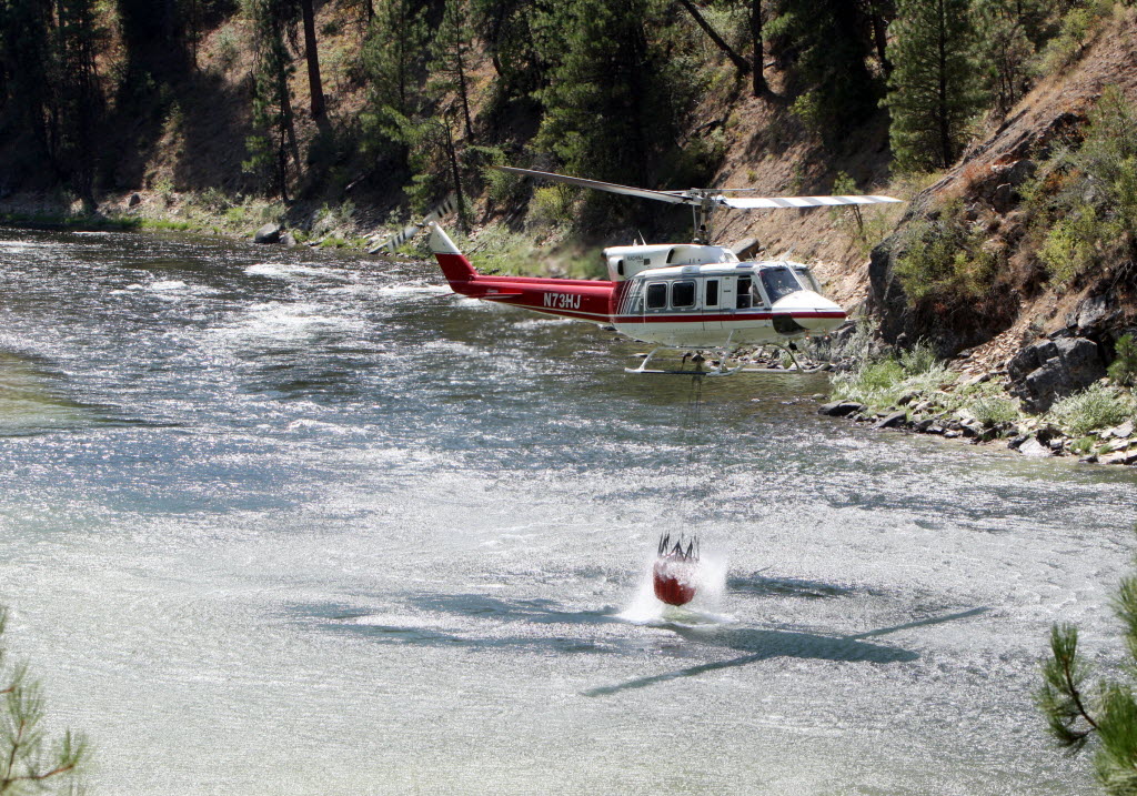 A forest service helicopter dips into the south fork of the Payette River on Monday afternoon, while battling the Springs Fire about four miles east of Banks. Story here. (AP/Idaho Statesman: Joe Jaszewski)