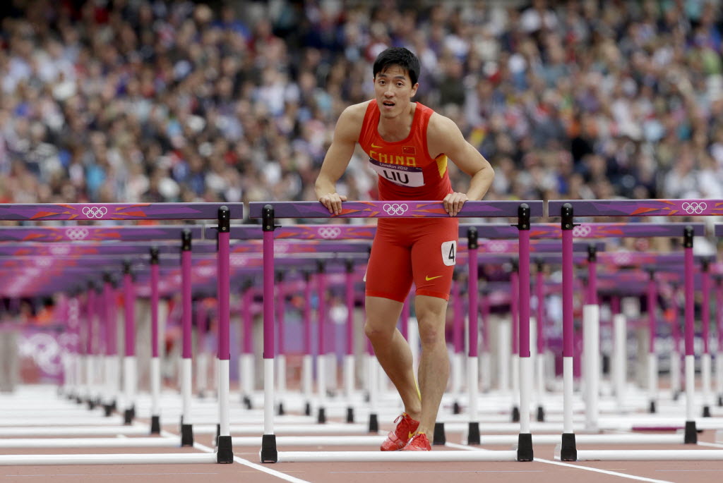 China’s Liu Xiang rests on a hurdle after falling in a men’s 110-meter hurdles heat during the athletics in the Olympic Stadium at the 2012 Summer Olympics, London, today. (AP Photo/Anja Niedringhaus)
