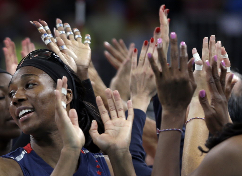 United States’ Foluke Akinradewo, left, celebrates with teammates after defeating the Dominican Republic in three sets in a women’s quarterfinal volleyball match at the 2012 Summer Olympics earlier today in London. (AP Photo/Jeff Roberson)