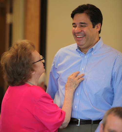 Ruthie Johnson, long-time aide to the late U.S. Sen. Jim McClure, prompts a laugh from Congressman Raul Labrador after Labrador’s speech to the Kootenai County Reagan Republicans luncheon at Templins today. (Phantom Photographer photo)