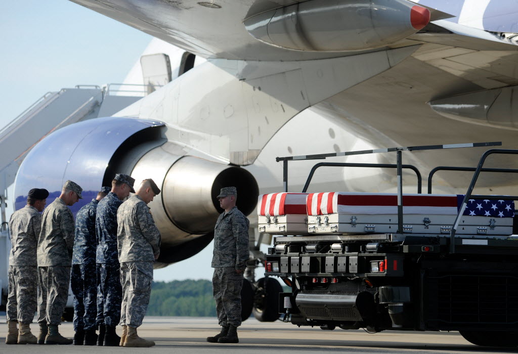Transfer cases containing the remains of Navy Petty Officer 3rd Class Clayton R. Beauchamp, left case, and Army Spc. Ethan J. Martin, right case, sit on a loader during a prayer today at Dover Air Force Base, Del. According to the Department of Defense, Beauchamp, of Weatherford, Texas, died Tuesday when enemy forces attacked his unit with an improvised explosive device in Helmand province, Afghanistan and Martin, 22, of Lewiston, Idaho, also died Tuesday in Koragay, Paktia province, Afghanistan of wounds sustained when he encountered enemy small-arms fire. Story below. (AP Photo/Steve Ruark)