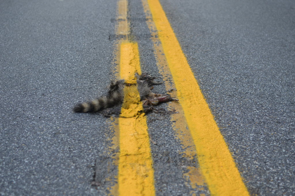 A dead raccoon with a road dividing line painted over it in Johnstown, Pa., was spotted by motorcyclist Sean McAfee, who provided this photo to the Associated Press. According to PennDOT traffic engineer John Ambrosini, paint crews know to avoid such animals and usually have a foreman on the job to clear any dead animals off the road before the paint-spraying truck equipment passes by. This crew didn’t have a foreman that day, and the equipment was too big to turn around in traffic on the curvy, narrow road so the line could be repainted without the carcass in the way. (AP Photo/Sean McAfee)