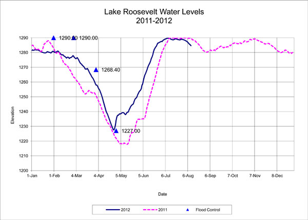 In order to meeting court ordered Biological Opinion targets and the Lake Roosevelt Incremental Storage target, the predicted elevation for August 31 is 1279.7. These are only predictions are subject to change with changing weather conditions, high power demand or other unforeseen power emergencies.
