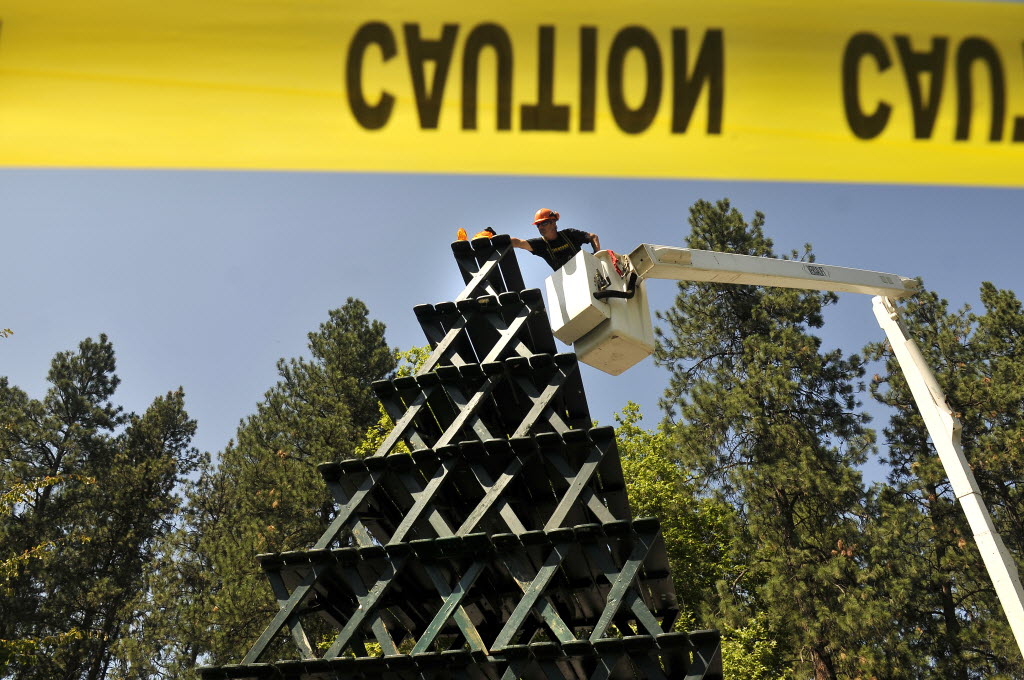 Using a bucket lift surrounded by caution tape, Miles Cooley of the Spokane Parks Dept. clears the hazard lights lined up on a giant stack of picnic tables at Manito Park Friday. Pranksters have built and left such stacks on at least two occasions this summer, requiring city employees to bring equipment used to prune trees to the site to safely unstack the tables. (Jesse Tinsley, SR)