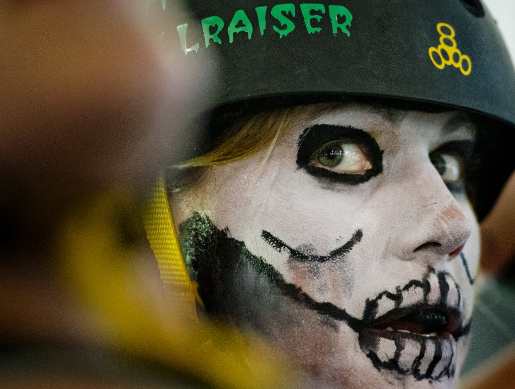 The Snake Pit Derby Dames’ Kristie Blair, who goes by Hooky Hellraiser #666 watches her roller derby teammates compete in a bout against the Ellensburg Rodeo City Rollergirls on Saturday at the Kootenai Fairgrounds in Coeur d’Alene. More photos here. (SR photo: Tyler Tjomsland)