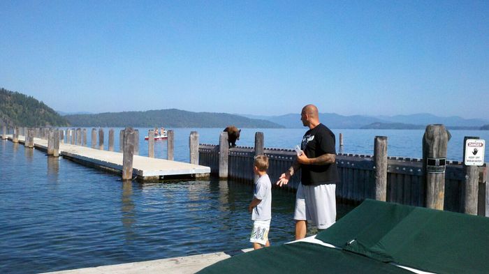 Pecky Cox/As The Lake Churns tells Huckleberries that bear sightings on Priest Lake have become routine this year. But this is carrying things a bit far. Michael Potesky snapped this photo of a bear that swam to Bishop’s Marina, hopped on to the breakwater & then the breakwater fence. Hopped off and swam in to shore.” The photo is posted on Pecky’s blog site here. Pecky emails Huckleberries: ” Dave; we have had SO MANY bear sightings this year, people just keep sending photos.. as the lake churns is trying to remind them to be safe, away and alert.”