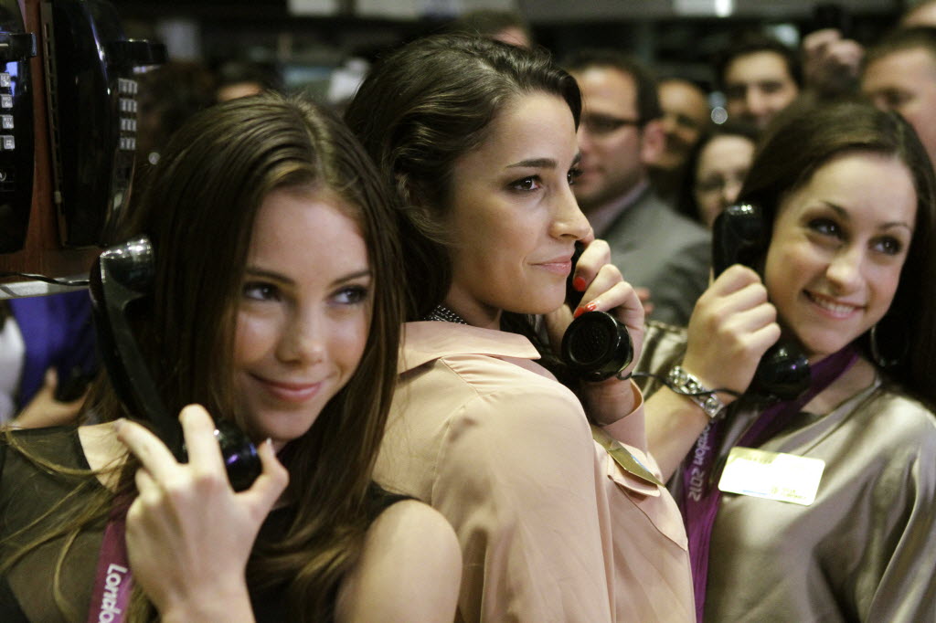 From left, McKayla Maroney, Aly Raisman and Jordyn Wieber, members of the United States women’s Olympic gymnastics gold medal-winning team, pretend to talk on telephones while posing for photos on the floor of the New York Stock Exchange, today in New York. (AP Photo/Alex Katz)