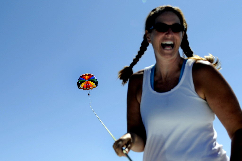 “He looked a little too comfortable,” said Karin Roberts of Spokane as she shook the line that was attatched to her husband Jeff Roberts during their adventure with Coeur d’Alene Parasailing on Tuesday. The trip was a surprise 20th wedding anniversary present from her husband. SReporter Scott Maben interviews family has provided parasailing recreation on north shore since 2003. Click here. (SR photo: Kathy Plonka)
