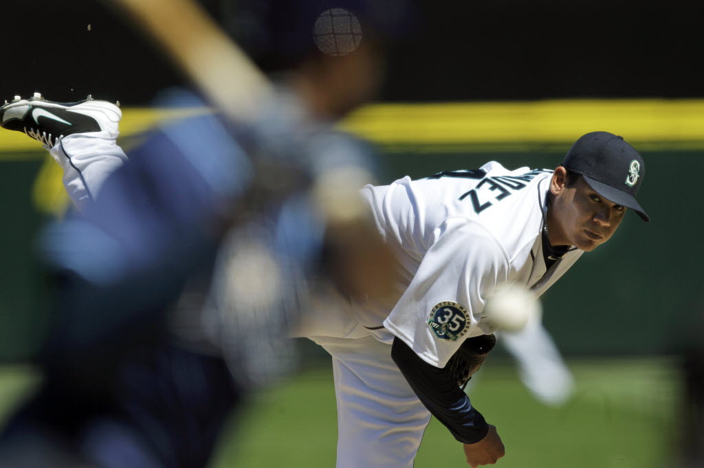 Seattle Mariners starting pitcher Felix Hernandez throws against the Tampa Bay Rays in the fourth inning of a baseball game this afternoon in Seattle. Hernandez tossed a perfect game in the Mariners 1-0 win. (AP Photo/Ted S. Warren)