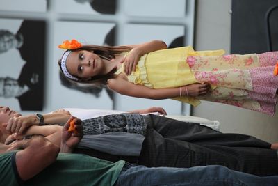 A little girl attending the Ryan Larsen Band free concert at Sherman Park Square, near 4th & Sherman in downtown Coeur d’Alene Tuesday evening, checks out proper way to stand at attention during playing of National Anthem. Another good crowd was on hand to enjoy another concert put on by Chris Guggemos’ Handshake Productions. (Duane Rasmussen photo for Huckleberries Online)