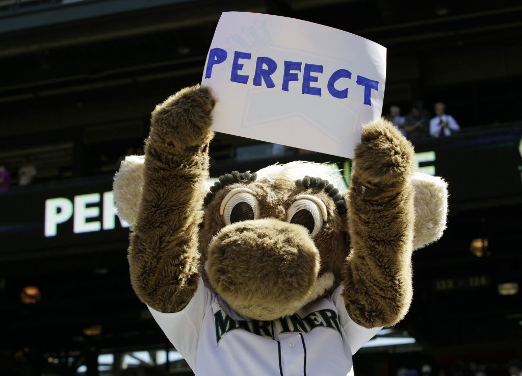 Mariner Moose, the Seattle Mariners’ mascot, holds a sign that reads “Perfect,” after Mariners’ Felix Hernandez threw a perfect game against the Tampa Bay Rays, Wednesday, in Seattle. The Mariners won 1-0. (AP Photo/Ted S. Warren)