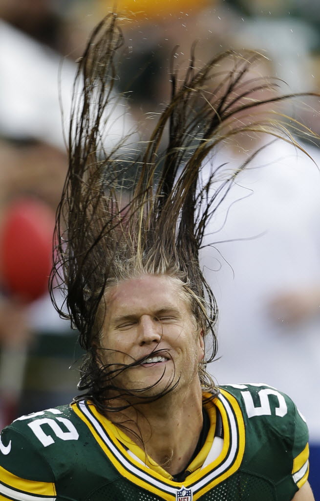 Green Bay Packers linebacker Clay Matthews flips his hair before a preseason NFL football game against the Cleveland Browns Thursday in Green Bay, Wis. (AP Photo/Jeffrey Phelps)
