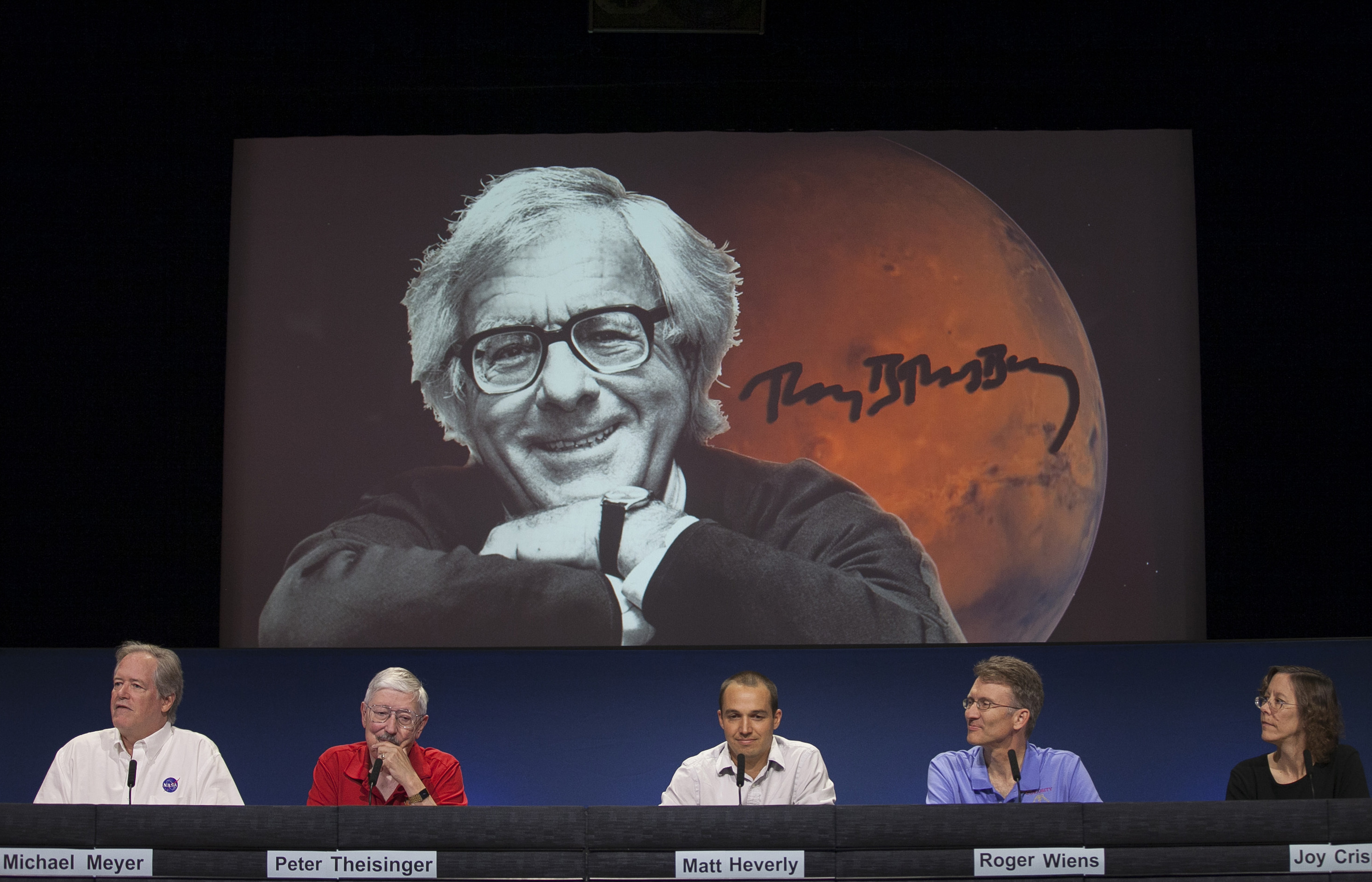 NASA scientists named the Curiosity touch-down area Bradbury Landing after writer Ray Bradbury, seen on screen, at the Jet Propulsion Laboratory in Pasadena, Calif., on Wednesday.