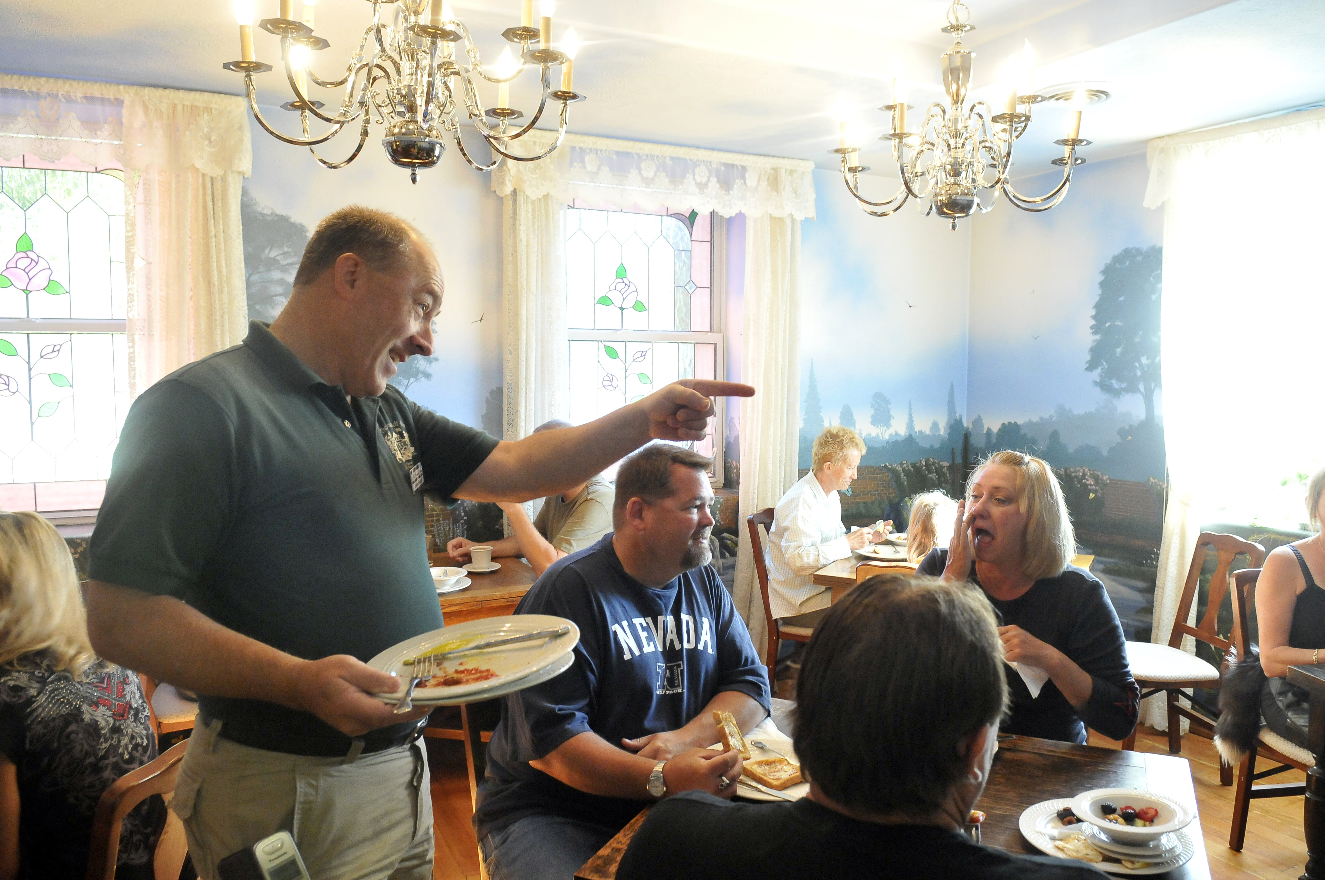 Innkeeper John Hough, left, jokes with guests at breakfast last Thursday at the Roosevelt Inn in Coeur d’Alene.