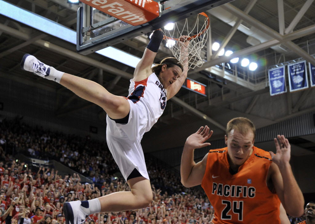 Gonzaga’s Kelly Olynyk finishes a flying dunk over Pacifi’s Travis Fulton in the first half Saturday in the McCarthey Athletic Center. Gonzaga has reached the Top 10 for the first time this year after dumping Pacific 85-67 to go 8-0 on the season. Story here. (SR photo: Dan Pelle)