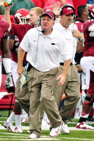 In this Sept. 15 file photo, Arkansas offensive coordinator and quarterbacks coach Paul Petrino reacts after the call on a recovery of an apparent Alabama fumble on a punt was reversed during the first quarter of an NCAA college football game in Fayetteville, Ark. Idaho announced today that Petrino will be its new head football coach after he produced some of the most prolific offenses in the nation as an assistant coach at several other schools. (AP Photo/April L. Brown, File)