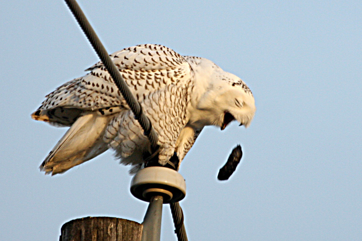 Local birder/photographer Ron Dexter caught the snowy owl in an act with his camera. The photo above might leave you a little breathless to see the size of that pellet. To the owl, it’s just another moment of relief.