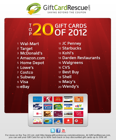 Today, we list the top 20 favorite gift cards, by retailer. This list comes by way of GiftCardRescue .