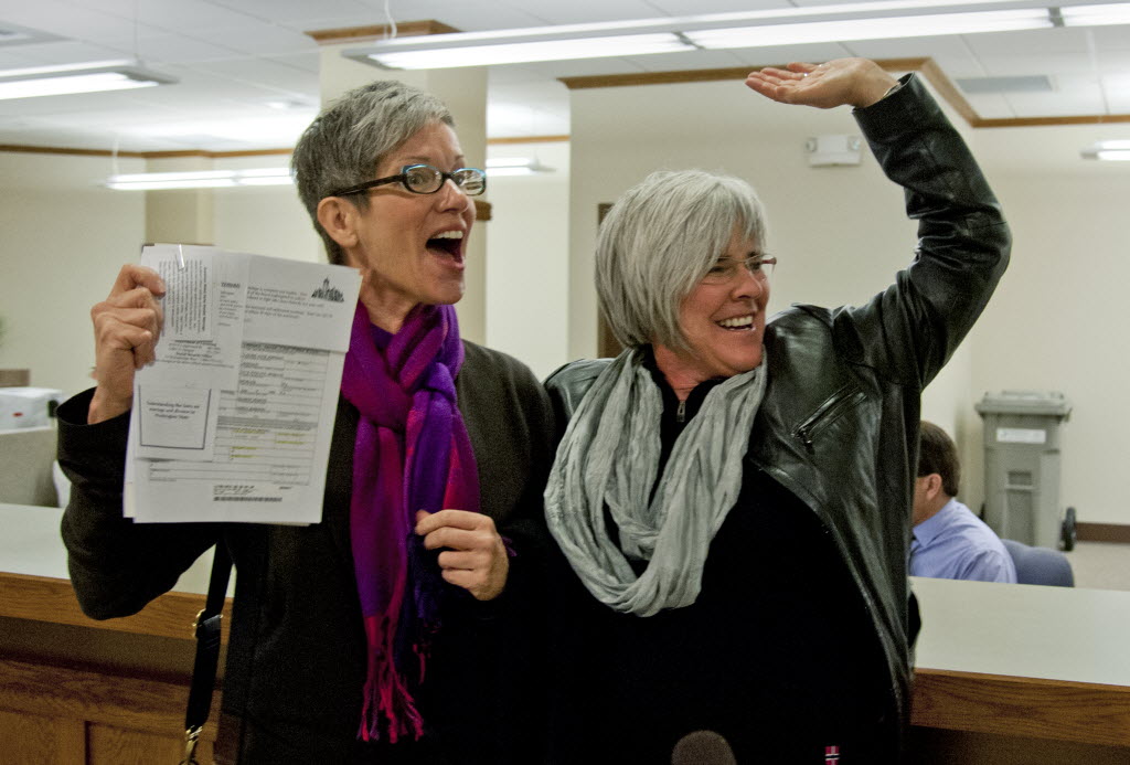 Laurie Johnson and Margaret Witt celebrate attaining their marriage license today at the Spokane County Courthouse. Story here. (AP Photo/Elaine Thompson)