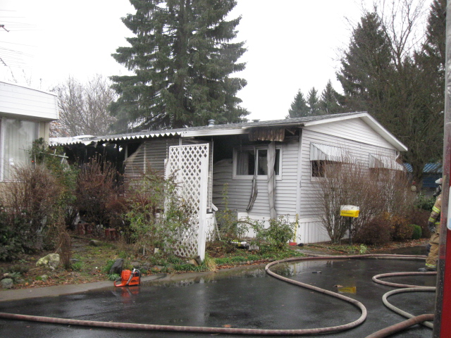 A mobile home in the River Rose Mobile Home Park at 2601 N. Barker Road was damaged by a fire Thursday at about 1 p.m. No one was home at the time of the fire, which appears to have started on a covered attached deck, according to a press release from the Spokane Valley FIre Department. The homeowner declined assistance from the Red Cross. The cause of the fire and an estimate of damages have not yet been determined. Photo courtesy the Spokane Valley Fire Department.