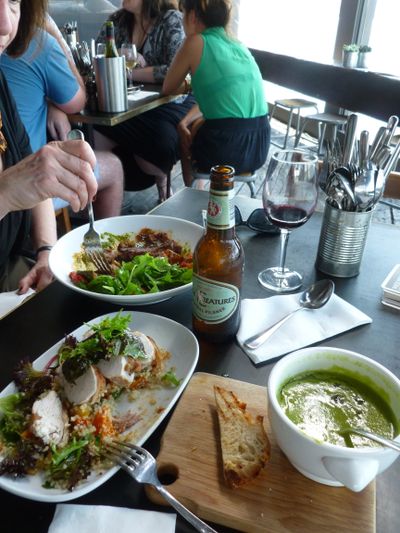 On our first day, we walked around the harbour area, the part known as Circular Quay (pronounced kay). And we ended up at a place called, aptly, The Bar at the End of the Wharf. That’s our order in the photo above, which included a Moroccan Chicken Salad , Mint Pea Soup, Roasted Lamb, a glass of shiraz and a pale ale. It was all tasty and far from, fish and chips or boiled mutton.