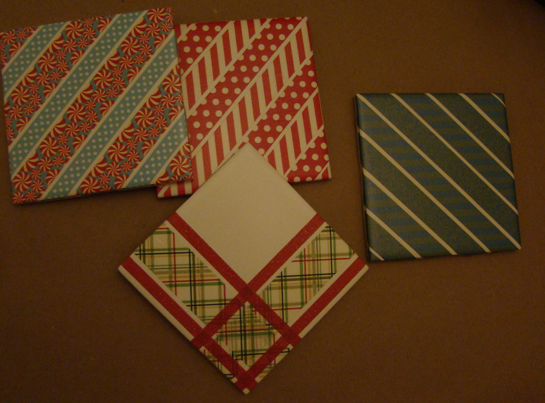 This time, we’re making coasters. I like having holiday coasters to go with holiday décor and these are both easy and inexpensive. They would also be a good hostess give (especially when paired with a bottle of wine). You could make none Christmas pictures with the same method, just choose different tape.