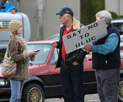 Brent Regan (middle), shown during a demonstration against Kootenai County’s land-use code by United Conservatives of North Idaho, was selected to fill a vacancy on the Coeur d’Alene School Board Monday night.