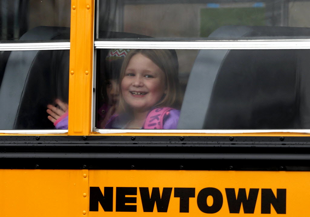 A young girl waves as her school bus pulls into Hawley School today in Newtown, Conn. Classes resumed Tuesday for Newtown, schools except those at Sandy Hook, following Friday’s mass shooting at the Sandy Hook Elementary School. Buses ferrying students to schools were festooned with large green and white ribbons on the front grills, the colors of Sandy Hook. At Newtown High School, students in sweatshirts and jackets, many wearing headphones, betrayed mixed emotions. (AP Photo/Jason DeCrow)