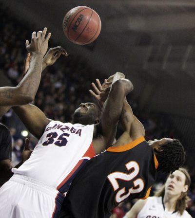 Sam Dower (35) and Campbell’s Reco McCarter (23) battle for a loose ball during the first half of an NCAA college basketball game in Spokane Wednesday. Gonzaga won the game 74-52 and will go on its Christmas break with an 11-1 record. See Jim Meehan story below. (AP Photo/Young Kwak)
