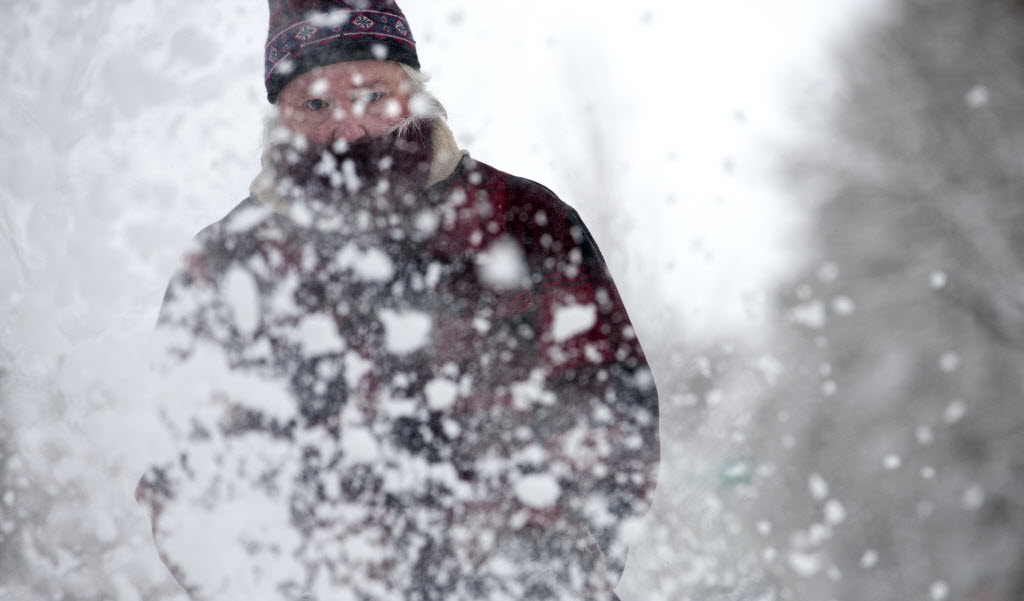 “Just call me Kris Kringle,” said Tim Shepperd as he cleared the snow from his driveway in Coeur d’Alene on Thursday. (SR photo: Kathy Plonka)