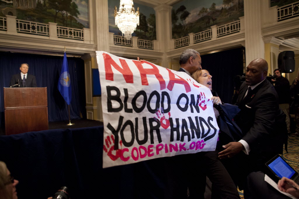 Activist Medea Benjamin, of Code Pink, is led away by security as she protests during a statement by National Rifle Association executive vice president Wayne LaPierre, left, during a news conference in response to the Connecticut school shooting on Friday in Washington. The nation’s largest gun-rights lobby is calling for armed police officers to be posted in every American school to stop the next killer “waiting in the wings.” Wall Street Journal story here. (AP Photo/ Evan Vucci)