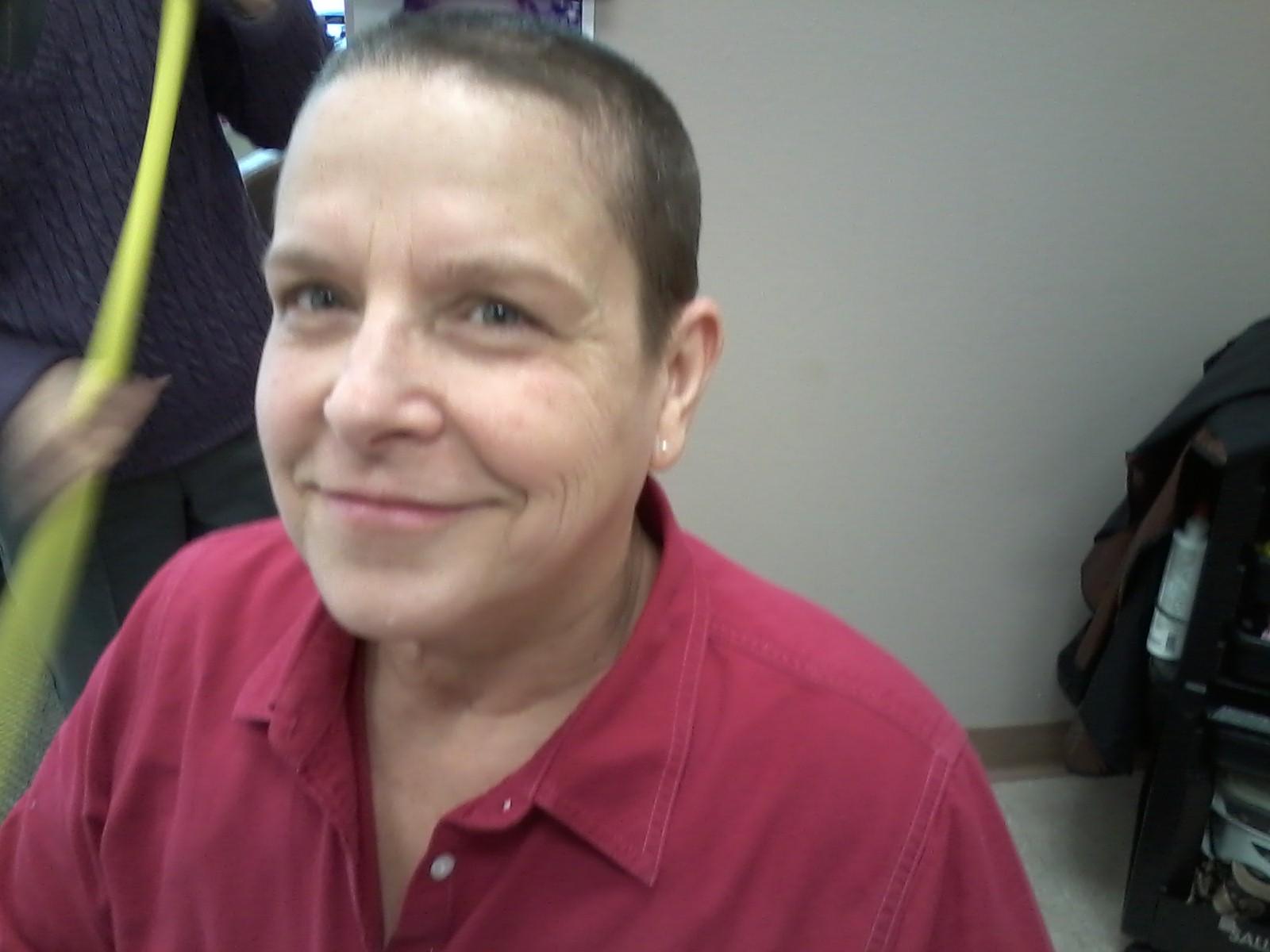 The salon became sacred space during the 20 minutes it took to cut and then shave Chris’ head, and in that sacred time, as Chris’ hair fell to the floor, I saw many of her family members emerge from her face. I saw her handsome older brothers, Dan and Dick, her son Peter, and also her mother Mildred. At some point, Sherrie discovered the cowlicks on the top of Chris’ head, which we remembered from her grade-school photos, and which Chris used to take a scissors to as a child to rid her head of them.