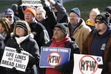 (AP photo: Protestors against the right-to-work issue gather at the state capitol Saturday)
