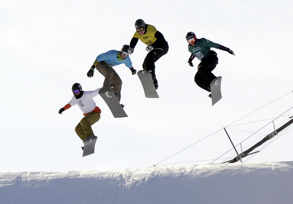 Sandpoint native Nate Holland, center right, leads a group of snowboarders over the final jump during the Winter X Games’ snowboarder boardercross quarterfinal on Saturday at Buttermilk Mountain in Aspen. Holland eventually won the gold medal. Eric Plummer story in Bonner County Bee here. (AP Photo/ Denver Post, Daniel Petty)