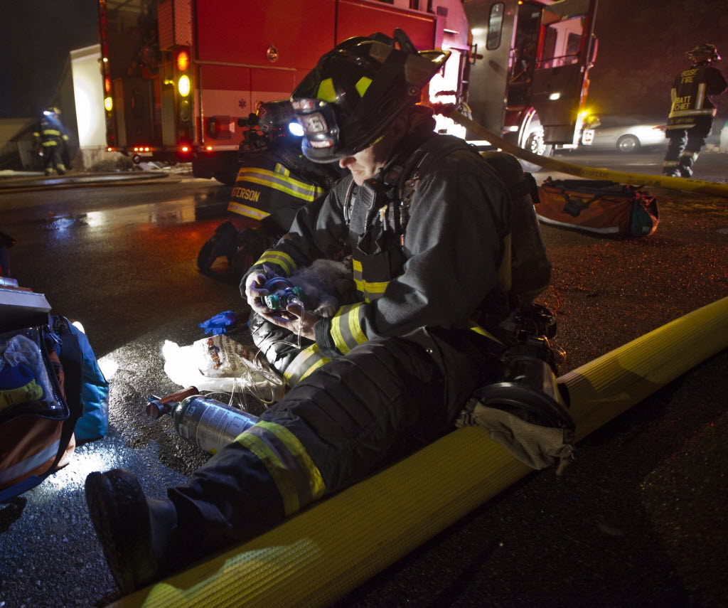 Boise firefighter Joe Ostermiller and other firefighters treated three cats with oxygen after rescuing them from a fire in a home on the 1100 block of Fox Lane in Boise Wednesday. A fire was reported by neighbors at 8 p.m. No one was home and the residence sustained heavy damage. Fire officials said the blaze started in a bedroom. Investigators were working to determine a cause. A crowd watched as firefighters used special masks to treat the cats with oxygen and cheered when one unconscious cat was revived. Story here. (AP/Statesman photo: Darin Oswald)