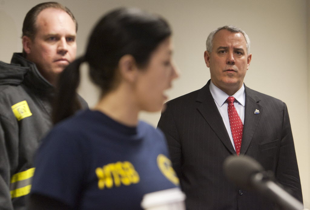 Zoe Keliher, NTSB Air Safety Investigator, along with Boise Mayor Dave Bieter, right, and Boise Fire Chief Dennis Doan, left, addresses media about the plane crash that killed Micron CEO Steve Appleton, at Boise Airport today in Boise. Stories below. (AP/Statesman: Katherine Jones)