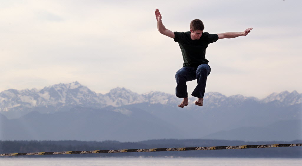 Bryce Beblavi leaps above a slackline of nylon webbing anchored between posts and in view of the Olympic Mountains in Golden Gardens park Tuesday in Seattle. After several days of sun and temperatures hitting near 60 degrees, a few showers and slightly cooler temperatures are predicted for the Puget Sound region. (AP Photo/Elaine Thompson)