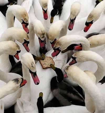 A duck tries to grab a piece of bread from a group of swans in a small area of open water on a frozen lake at the Royal Society for the Protection of Birds site in Fairburn Ings near Castleford, northern England earlier today. Most of the lake is frozen as the severe winter weather continues in parts of the United Kingdom. You write the cutline. (AP Photo/PA, John Giles)